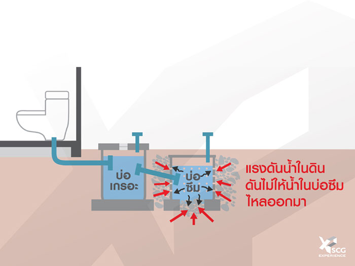 แต่ถ้าหาก ดินที่อยู่โดยรอบ บ่อซึม เป็นดินเหนียว หรือ ดินที่มีคุณสมบัติอุ้มน้ำ หรือบริเวลณลุ่มน้ำท่วมถึง แรงดันจากนั้นในดินอาจจะทำให้บ่อซึมระบายน้ำสู่ดินได้ไม่เต็มประสิทธิ์ภาพ จึงเป็นที่มาของปัญหาส้วมตัน กดชักโครกไม่ลง ราดน้ำไม่ลง และอีกทั้งยังส่งกลิ่นเหม็น จึงต้องทำการสูบกากของเสียจากบ่อเกรอะ (สูบส้วม)